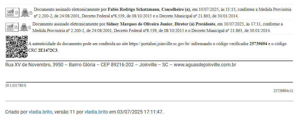 Declaro que recebi o Código de Conduta e Ética atualizado da Companhia Águas de Joinville, compreendo os padrões que se aplicam ao meu trabalho e concordo em cumprir seus termos, bem como estou ciente de que o não cumprimento poderá implicar ações disciplinares. Aceito a responsabilidade de estimular a boa conduta ética no ambiente de trabalho e manter uma comunicação aberta com os outros, em relação a questões de práticas de conduta.
