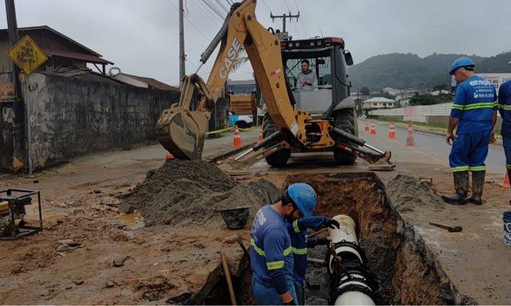 A Companhia Águas de Joinville dá continuidade à manutenção emergencial de um vazamento de água na rua Tuiuti, próximo ao número 3.186, no bairro Aventureiro. A previsão inicial é que os serviços sejam concluídos até 13 horas.