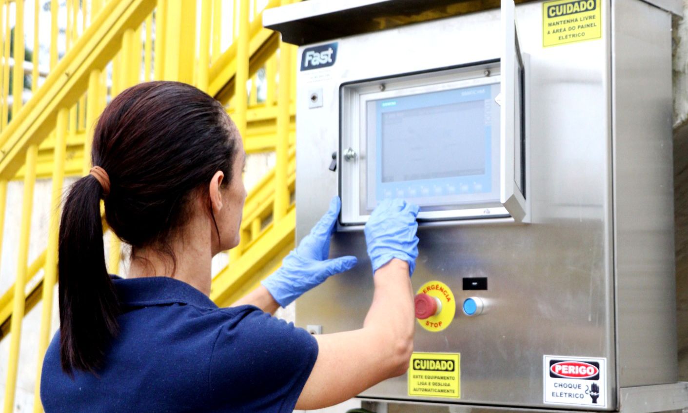 A ETE também está equipada com alta tecnologia para controle de odores. São os lavadores de gases – equipamentos que auxiliam na remoção de substâncias gasosas formadas durante o processo de tratamento de esgoto.