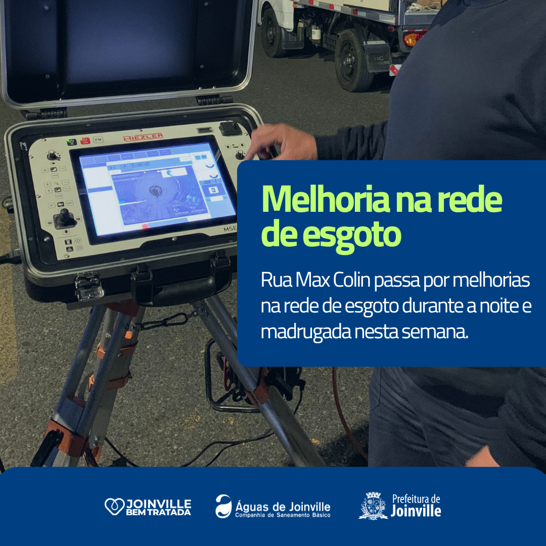 A Companhia Águas de Joinville realiza, no mês de dezembro, melhorias na rede de esgoto da rua Max Colin. Para evitar transtornos no trânsito, o trabalho será executado das 21h às 6h do dia 10 até 15 de dezembro (terça-feira a domingo).
