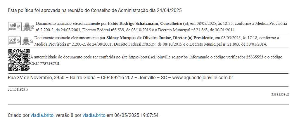 V – Revoga-se a Política SEI nº 0021376625/2024 de 25 de maio de 2024, da Companhia Águas de Joinville.