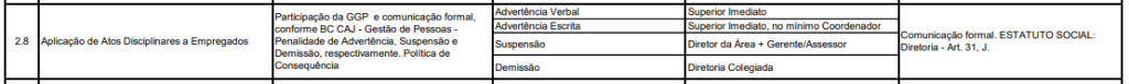 | GGP | Apoiar tecnicamente o processo de aplicação de medidas disciplinares conforme RAJ 15.01.01-01 – Limites de Alçada. |