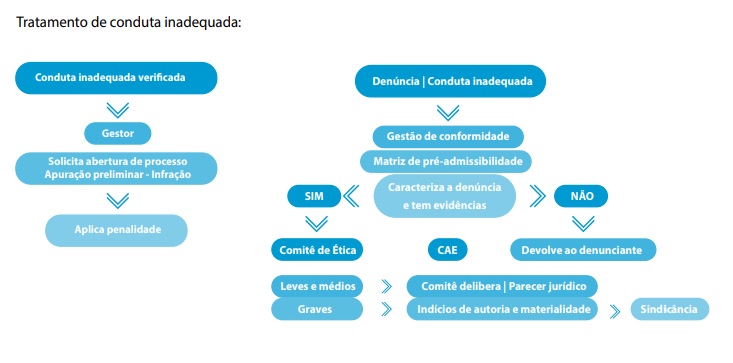 As denúncias também podem ser ser manifestadas por outros canais, complementarmente, conforme Base de Conhecimento supracitada. Todas as denúncias serão submetidas a uma análise de pré-admissibilidade, na qual são verificados elementos que caracterizem a materialidade da mesma para, se confirmados tais requisitos, sejam enviadas para tratativas pelo Comitê de Ética, Comitê de Auditoria Estatutária ou diretamente para instauração de uma Sindicância.
