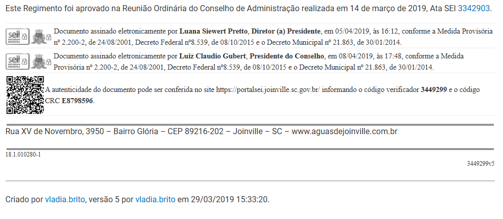 - Publicação da ementa: decisão contendo sanção, recomendação ou acordo de conduta no site da Companhia Águas de Joinville.